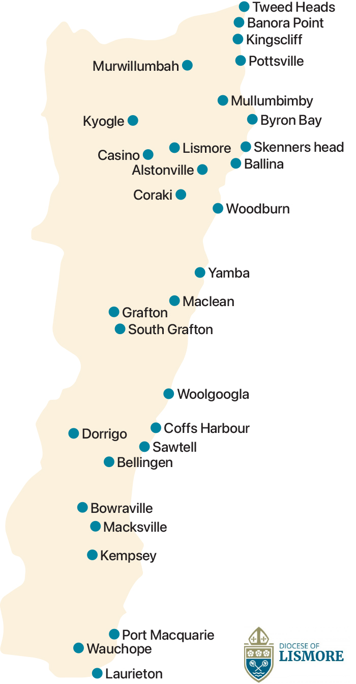 Our parishes are made up of people of all ages, cultures and backgrounds. Coming from all walks of life, we are united by our love for God, faith and neighbour. Our diocese hugs the east coast and is made up of 22 parishes stretching form Tweed Heads in the north and Laurieton in the south.